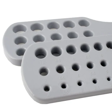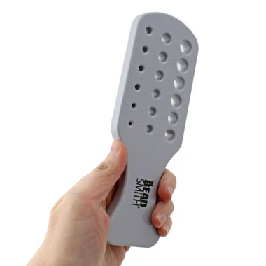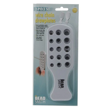 This 2 piece draw plate set is used to draw wire chain through to smooth, shape, condense, work-harden, and lengthen it without damaging the wire finish. Use for knitted, crocheted, woven, or braided wire chain made from silver, gold, copper, permanently colored copper wire, and flexible beading wire. Start with a length of knitted or braided wire rope, then draw it through increasingly smaller holes until it is the size you need. Each hole is slightly tapered to make a smoother and more even draw. One plate has 18 holes from 1.5mm to 10mm, while the other plate has 15 holes from 7.5mm to 14.5mm both in 0.50mm increments. Large plates fit in hand nicely and measure 7.25″ x 2.5″.