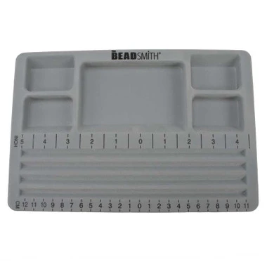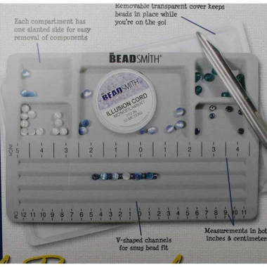 Travelers bead board features a removable cover so you can take your project anywhere. Its flocked surface helps prevent beads from rolling. It has recessed sections for sorting beads and findings. Each rectangular compartment has one slanted side for easy removal of components, and its specially designed channels will allow you to arrange jewelry projects. Measurements marked in both inches and centimeters.