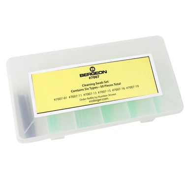 This Assortment of Bergeon cleaning swabs is a smaller version of the popular Bergeon 7007-S assortment. This collection of cleaning swabs is perfect for jewelers and watchmakers because it has 5 to 10 pieces of each of the 6 different types of swabs. With this assortment on hand, you will be able to handle every type of cleaning need that may arise for months to come. With so many different types of swab heads, you will never have to try and find the right cleaning swab or q-tip again. They are great for cleaning the largest, easy to reach areas to the smallest, hard to reach places. Supplied in a strong six compartment plastic box with snap closure. Kit includes the following: