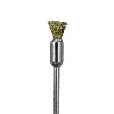 Crimped brass wire end brushes come in a package of 12, they have a 1/4″ inch bristle length and 3/8″ inch diameter heads which are mounted on 3/32″ mandrels for quick mounting into drill, flex shaft or other rotary tools. Brass offers a stiff bristle that is non-sparking and won’t scratch softer metals. Work well on yellow metals such as copper and brass.