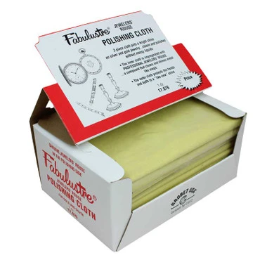 This 9″ x 11″ two-piece jewelry polishing cloth uses a polish and buff process that will put a bright shine on silver and gold jewelry. Remove tarnish, clean and polish your silverware, gold, nickel, jewelry and more without dealing with messy liquids. The inner cloth is impregnated with Fabulustre® professional jewelers’ rouge, a final polish compound that removes small scratches and any tarnish or debris from the metal. The outer cloth protects your hands and buffs the piece to a “like-new shine”. It can be used until it wears out. This is the easiest way to give your metal items a professional quality polishing job. Packaged and sold individually, purchase a dozen cloths and we will send them in Fabulustre’s retail box, which has a fold-up top to display the polishing cloths features and price.