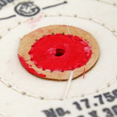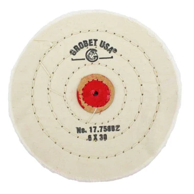 Soft textured muslin buff has four rows of stitching and leather center. Â Use with tripoli or rouge compounds for final high shine polishing.