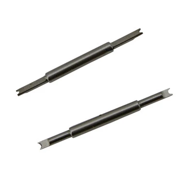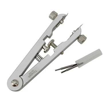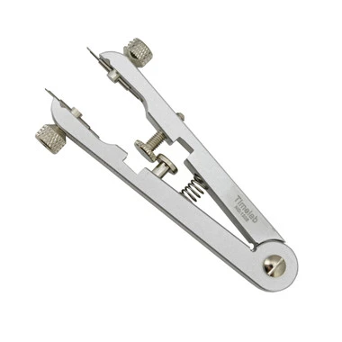 Used to precisely remove and insert spring bars. It features 2 forked tips which grip and compress the spring bar from both sides and adjusts easily from 6mm to 30mm with the knurled set screw. Supplied with two pairs of forked tips which fits easily between the watch case lug and bracelet or strap. This is a must have tool for removing and replacing watch bands.