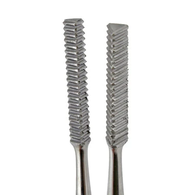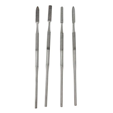 This set of four wax needle files is a great value! These spatula shaped carvers feature serrated heads on one side and knurled handle for a secure grip. Shapes included are 3 square, flat (serrated on all sides), and two half round (one serrated on flat side, the other on half round side). Each file is 6.75″; designed for wax filing and shaping, but also useful on other materials such as plastic and wood.